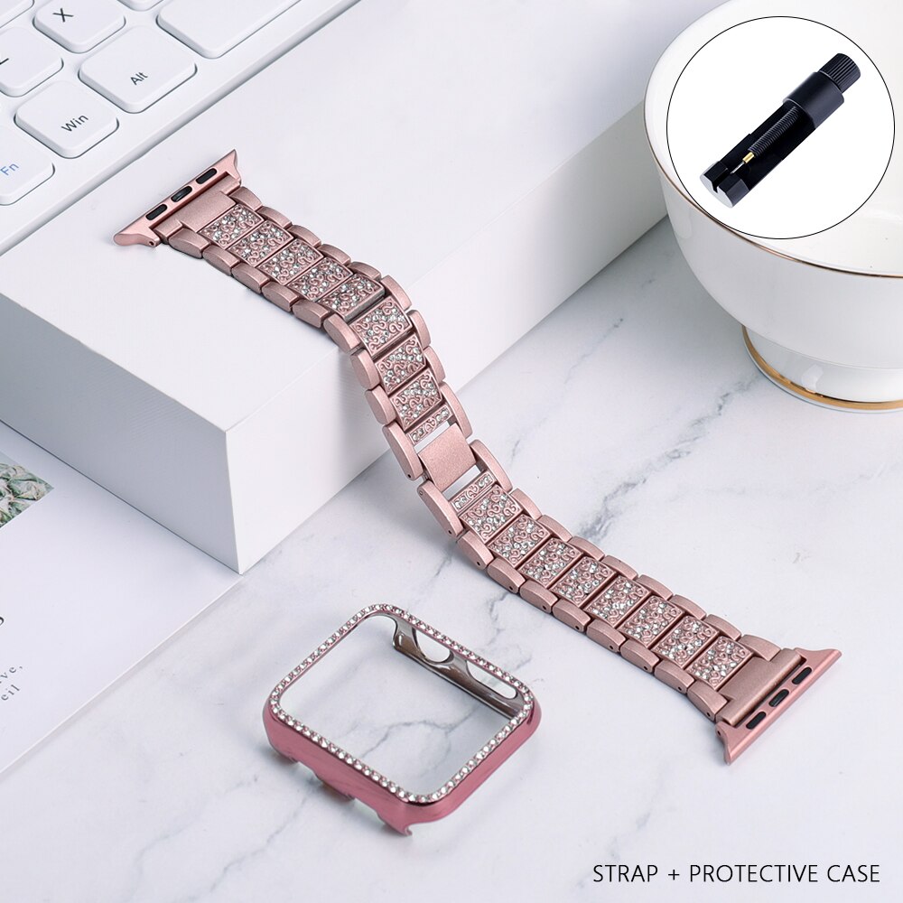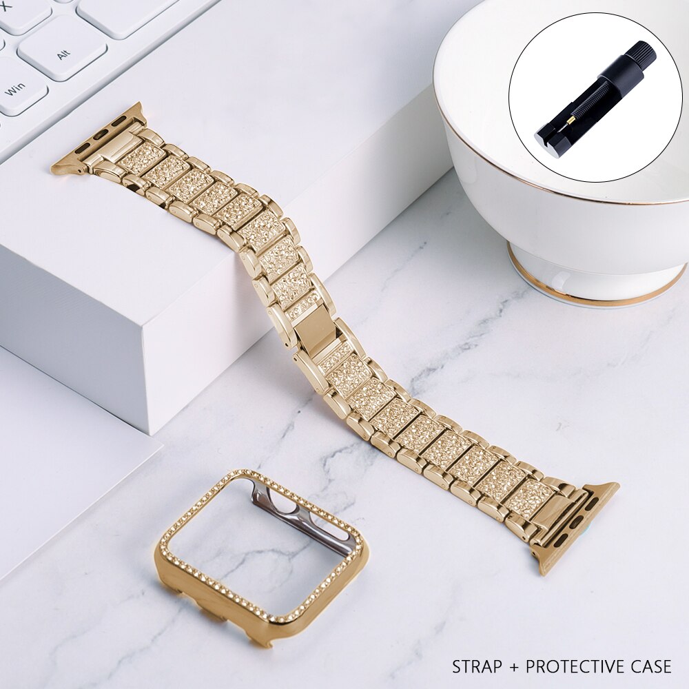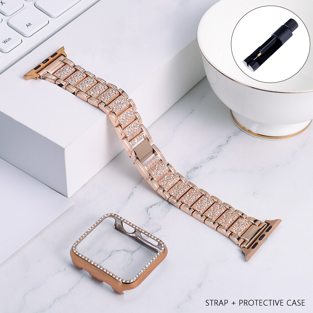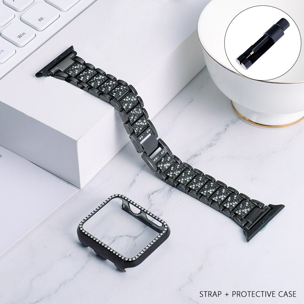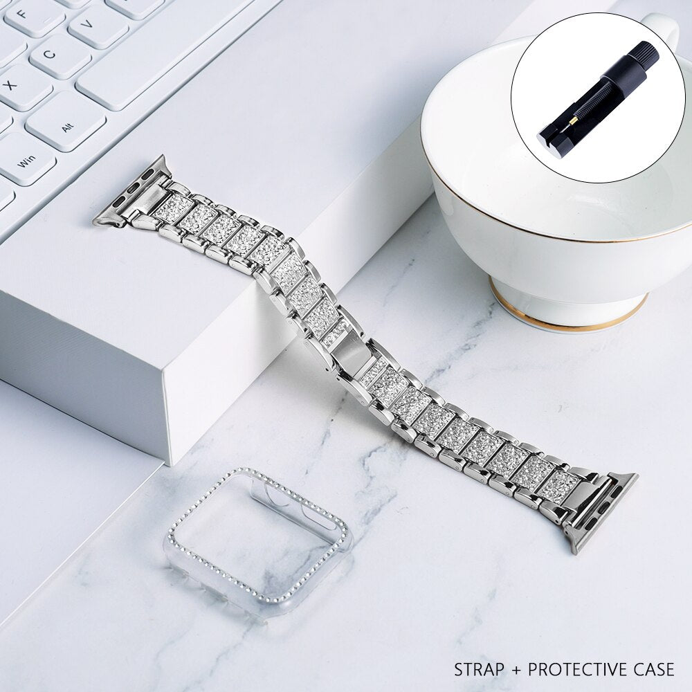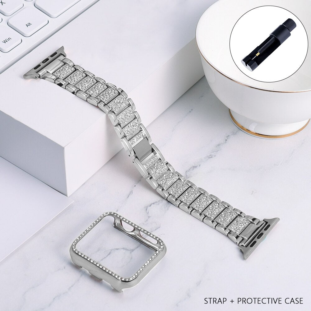 Introducing the ultimate fusion of fashion and function β our Band + Case Metal Strap for Apple Watch Series 6, 5, 4, and beyond! Transform your wrist into a canvas of elegance with a diamond-studded case and a sleek stainless steel bracelet, designed to turn heads and capture hearts.