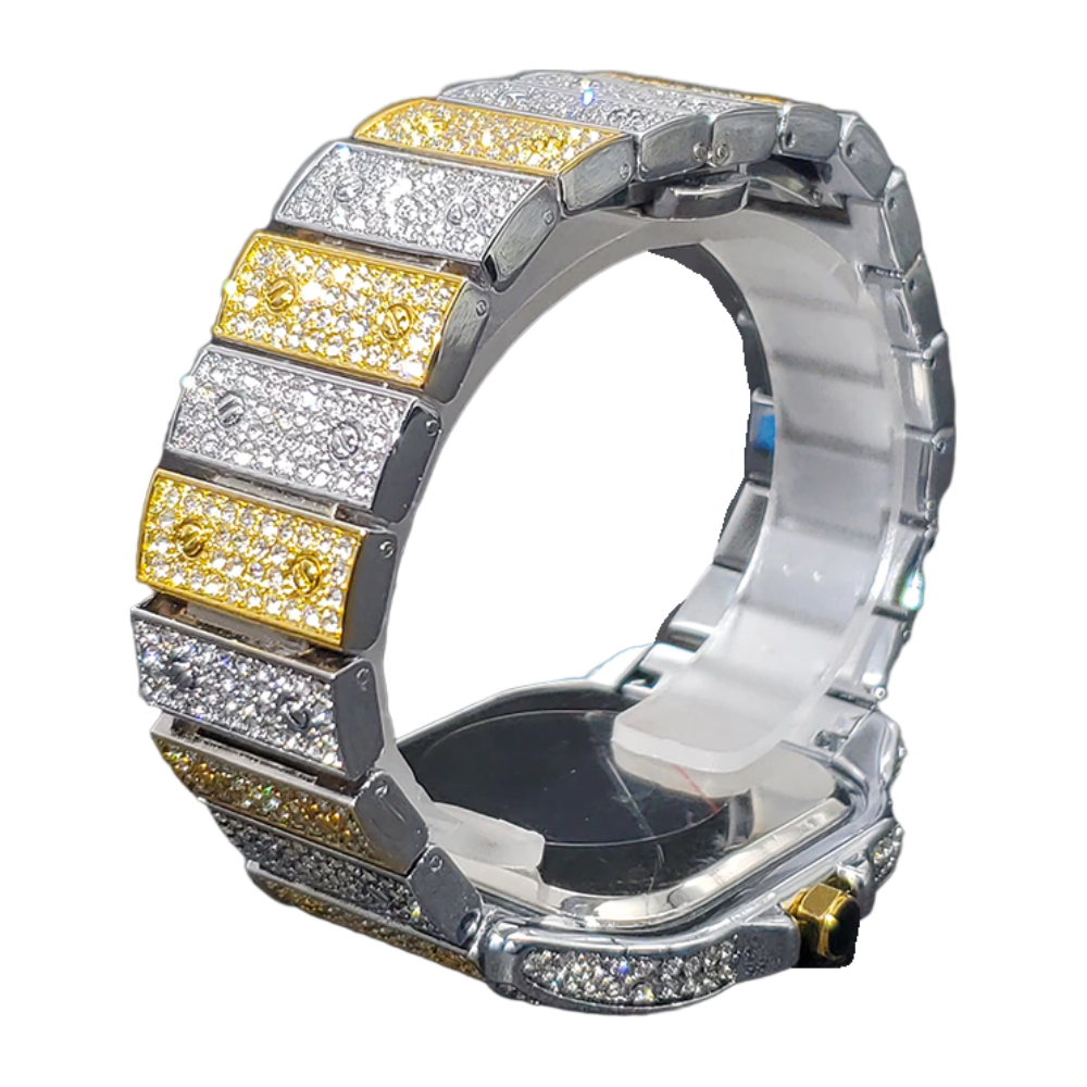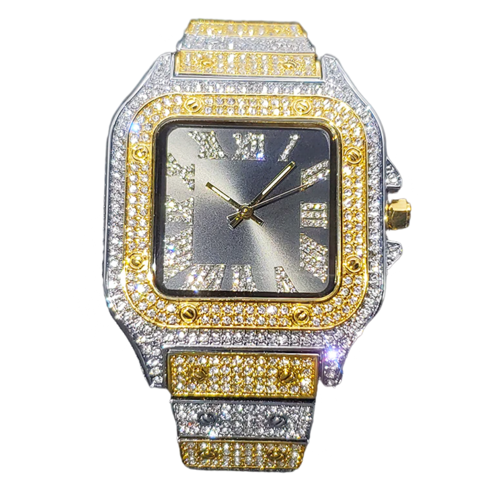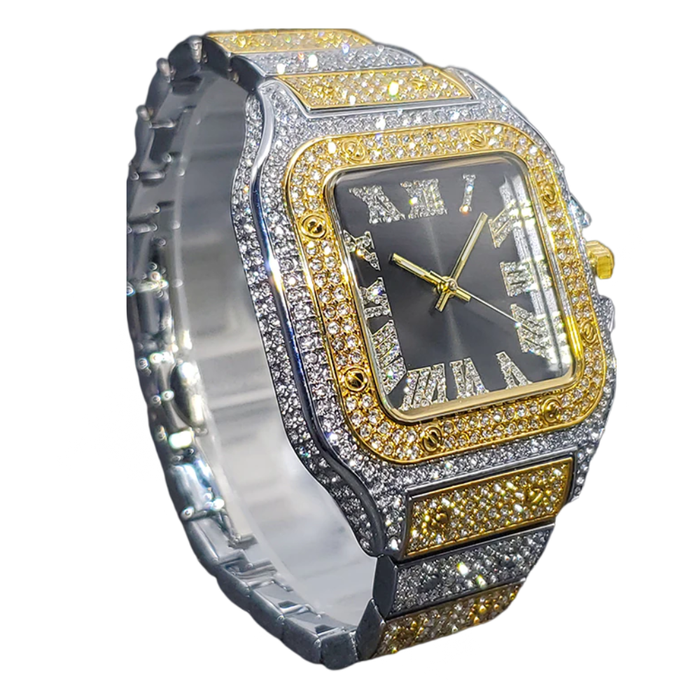 Iced out square watches with a combination of gold and silver colors and crystals can be a stunning choice that blends elegance and modern style. Square watches have a unique aesthetic appeal, and when adorned with crystals, they can create a captivating and luxurious look. Square watches offer a distinct and stylish alternative to traditional round-shaped watches. The combination of gold and silver colors adds versatility, allowing the watch to complement both gold and silver jewelry or accessories. The crystals enhance the watch's appearance, adding sparkle and a touch of glamour.